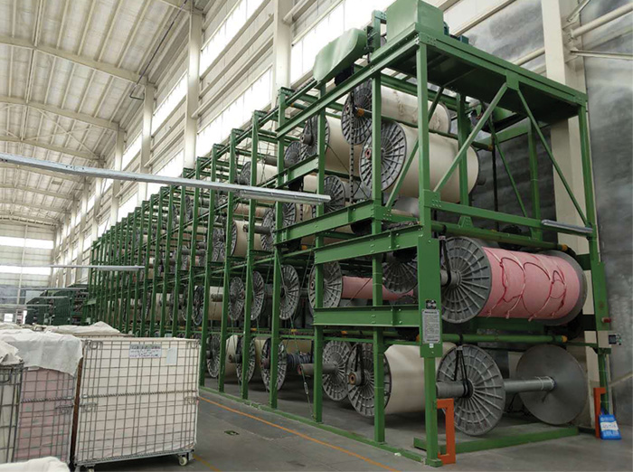 經(jīng)軸染色機(BEAM)將織物卷于多孔滾筒的卷軸之上,裝填于壓力